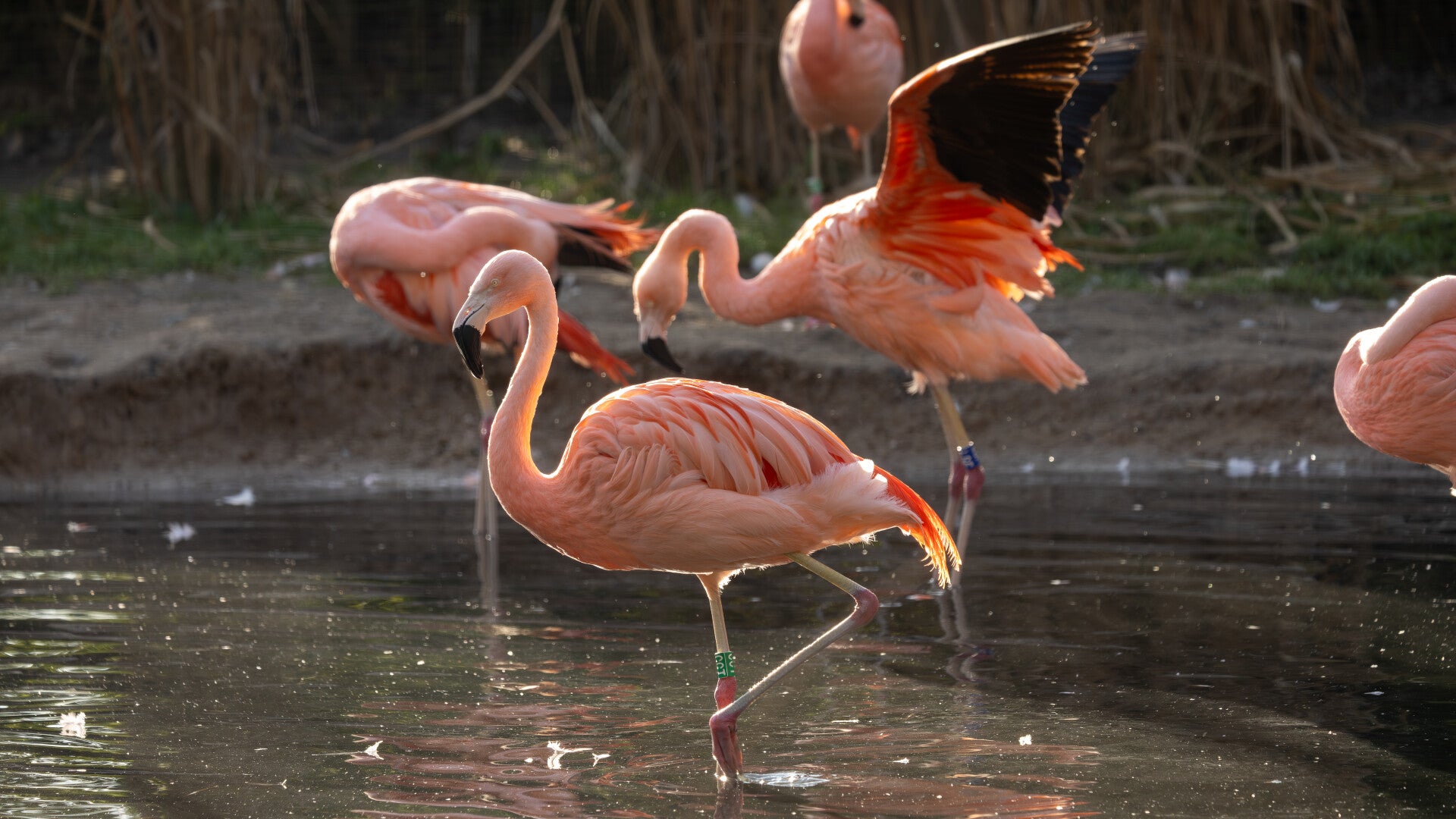- Op één poot staan: Ze doen dit om energie te besparen, hun gewicht passief te dragen, en mogelijk om af te koelen in het water.
