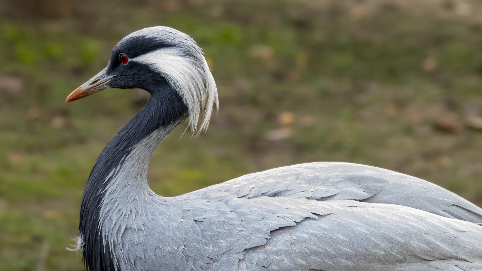 - Kleurenpracht: Grijs met zwarte nek en borst, opvallende witte plumes achter het oog, en afhangende zwarte veren.