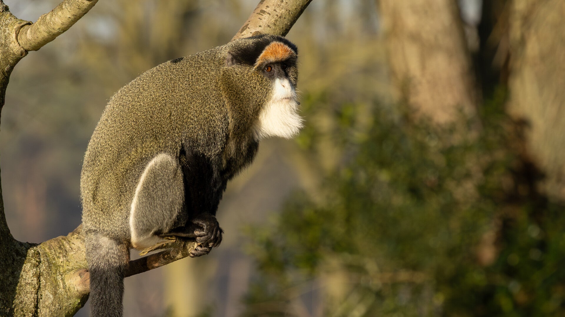 - Uiterlijk: Ze hebben een grijsgespikkelde vacht, een opvallende lange witte baard, een witte snuit en een oranje, halvemaanvormige streep op hun voorhoofd. Mannetjes hebben ook een duidelijk blauw scrotum.
